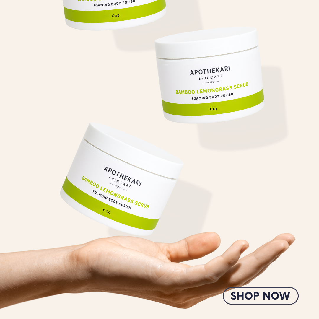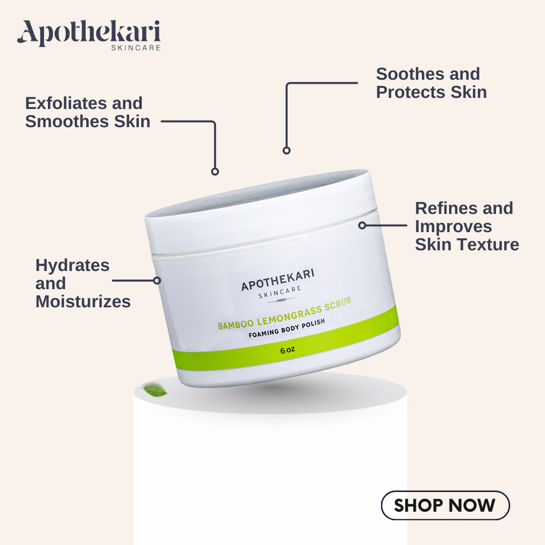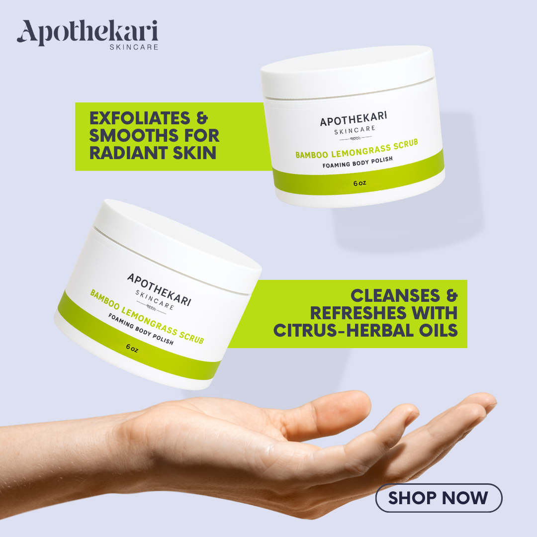 This invigorating exfoliating polish helps to revitalize and invigorate your skin and your senses. Made with walnut shell powder, powdered bamboo and a light, refreshing essential oil blend. Powdered bamboo comes from the hill forests of India to tone, refine texture, and improve skin vibrancy. Corn and coconut cleansing agents derived botanically gently lift away impurities. Meadowsweet extract delivers salicylate derivatives, which lend anti-inflammatory and analgesic properties to soothe skin. It also contains flavonoids and tannins that fight free-radical activity. A certified organic complex of algae and rice extracts provide substantive hydration and moisturizing benefits. Along with milk thistle they leave skin smooth and supple. This isn't just any old body polish. Gentle exfoliating and subtle foaming action make it the perfect way to soften rough patches and leave skin feeling soft, smooth and silky. Try it in your morning shower for a perfect way to kick off your day!Punch up the smoothness with this invigorating exfoliating polish for the body! Apothekari Bamboo Lemongrass Foaming Body Polish (6 oz) revitalizes and invigorates your skin and your senses with walnut shell powder, powdered bamboo and a light, refreshing essential oil blend of lemongrass, mimosa, and litsea! Find Apothekari Bamboo Lemongrass Body Polish combined with our Shea Body Butter in our Smooth Skin Set with special pricing.