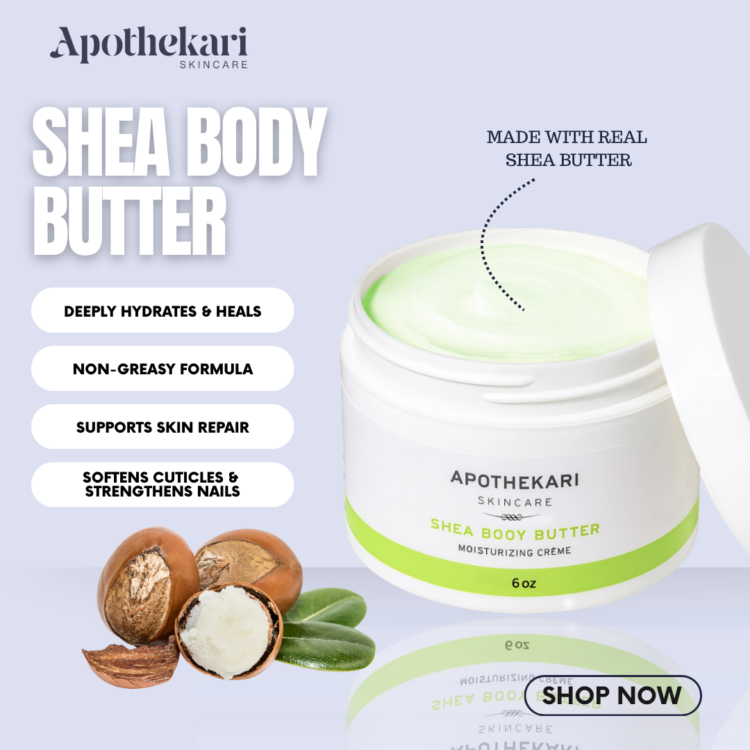 Pamper and treat dry skin with our therapeutic Shea Body Butter (6 oz). Our luscious body butter was inspired by and created for gardeners, farmers and carpenters. Designed for dry, rough, callused, and cracked areas such as hands, feet, elbows and knees, it offers deep hydration and protection to heal and moisturize skin, leaving softness behind. Made with organic shea butter and infused with healing herbs, fresh oils, natural vegetarian waxes and a calming and uplifting blend of essential oils, including fortifying rosemary and refreshing, cold-pressed Valencia sweet orange oil. It penetrates deeply and is excellent also, as a daily hand crème, aiding in the health of cuticles and nails. Non-greasy.